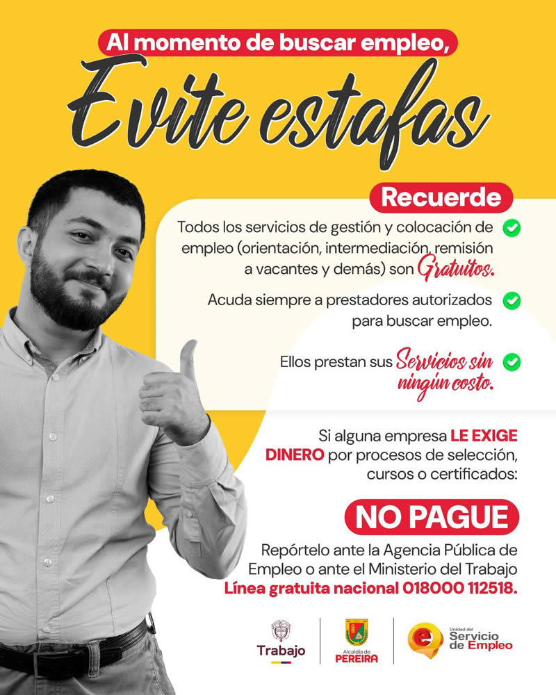 La #AlcaldíaDePereira, bajo el liderazgo del alcalde #MauricioSalazar, junto a la Agencia Pública de Empleo y el Ministerio del Trabajo, hace un llamado a la comunidad para estar alerta frente a ofertas laborales falsas o fraudulentas que circulan en redes y medios informales.