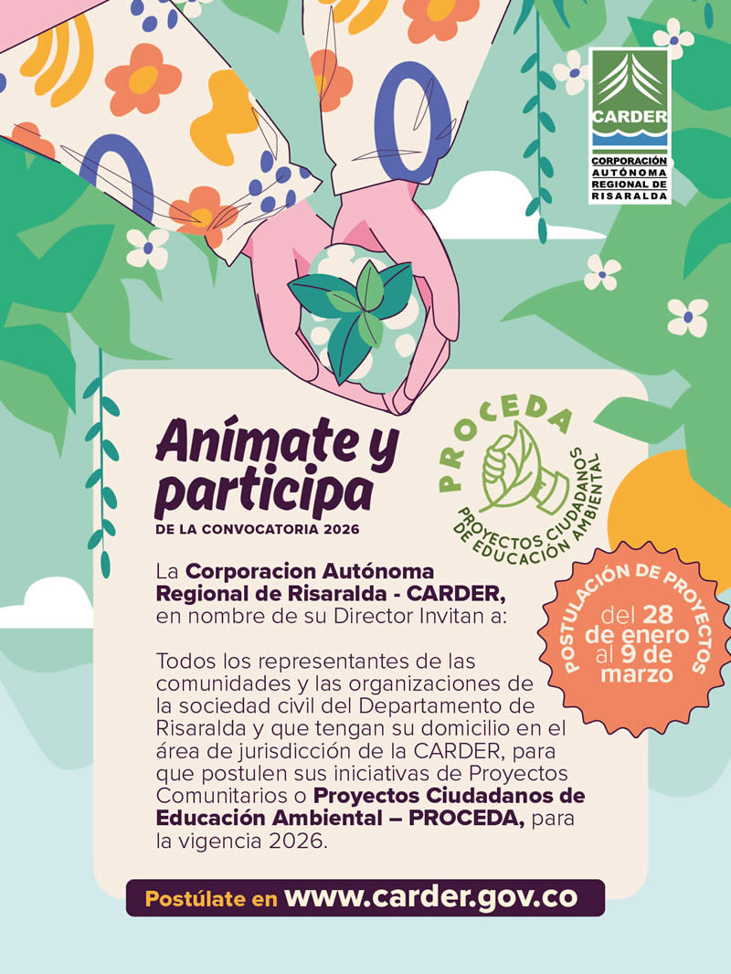 La Corporación Autónoma Regional de Risaralda (CARDER) anuncia la apertura oficial de la convocatoria para los Proyectos Ciudadanos de Educación Ambiental (PROCEDA) correspondientes a la vigencia 2026.